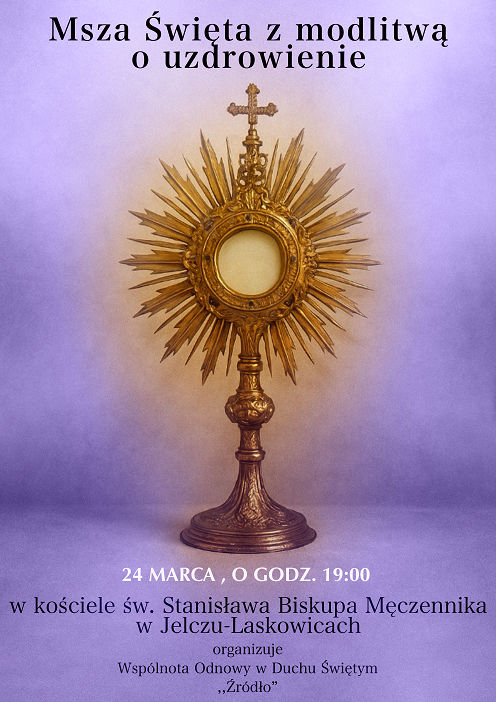 Wspólnota Odnowy w Duchu Świętym ŹRÓDŁO zaprasza na Mszę św. i nabożeństwo z modlitwą o uzdrowienie.