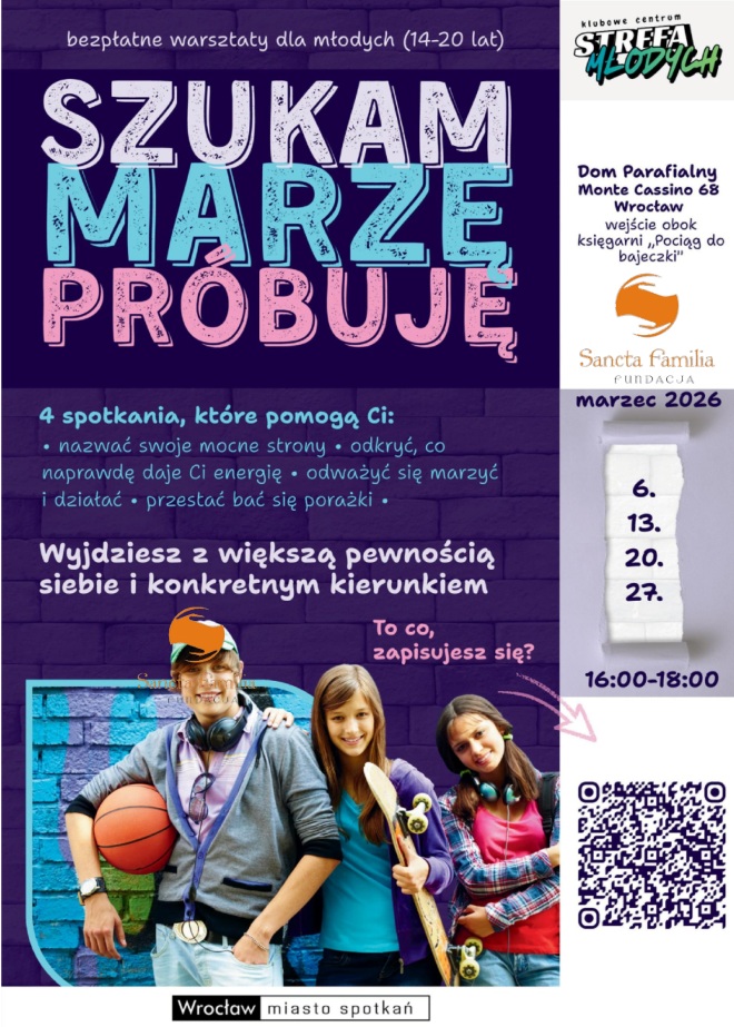 Przekażcie rodzicom, dziadkom, nastolatkom, znajomym zaproszenie na bezpłatny cykl warsztatów rozwojowych skierowanych do mieszkańców Wrocławia w wieku 14–20 lat. które odbędą się w domu parafialnym ul. Monte Cassino 68 we Wrocławiu.Udział w warsztatach jest bezpłatny (współfinansowany przez Gminę Wrocław).