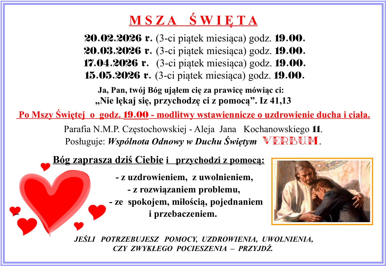 Wspólnota Odnowy w Duchu Świętym VERBUM zaprasza na Msze Św. z modlitwą o uzdrowienie.